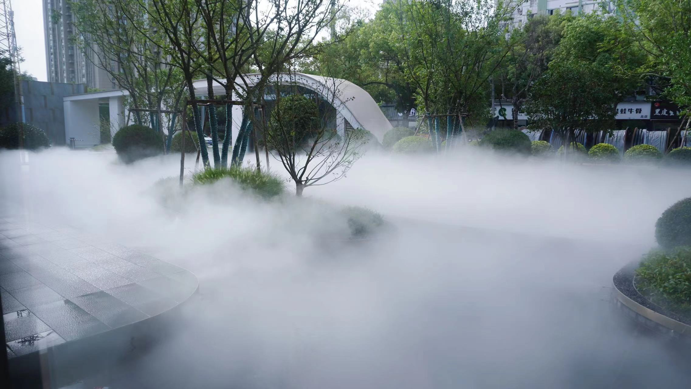 汉口福星华府K9营销中心景观雾森系统采用高压喷雾技术打造打造绿色景观。